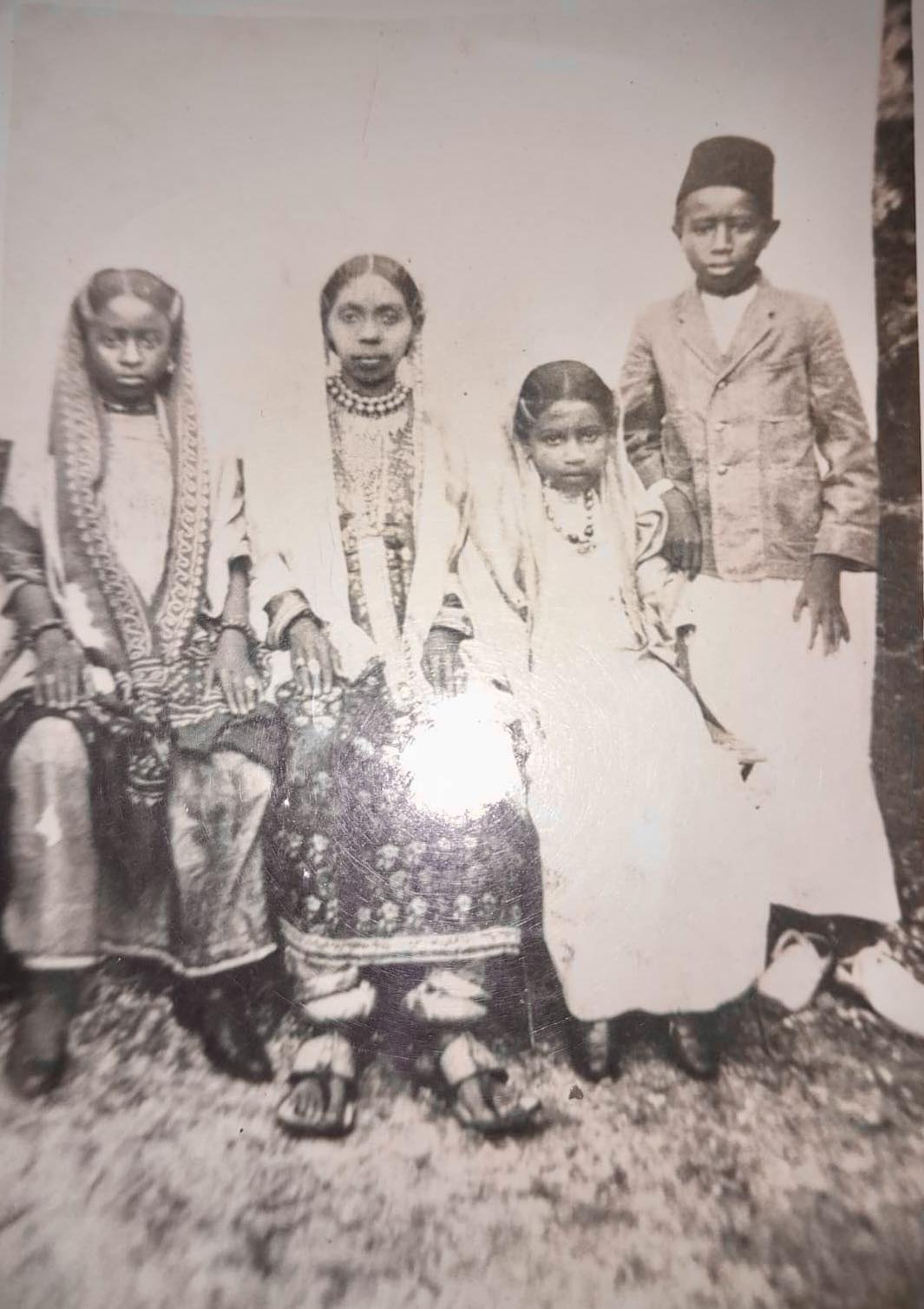 à sa gauche sa fille Bwéni Boira-sidi bint Sidi ibn Mohammed-El fass DAWOU -FIHRI et à sa droite ses autres enfants : Bwéni Roukia et Abdou ibn Sidi