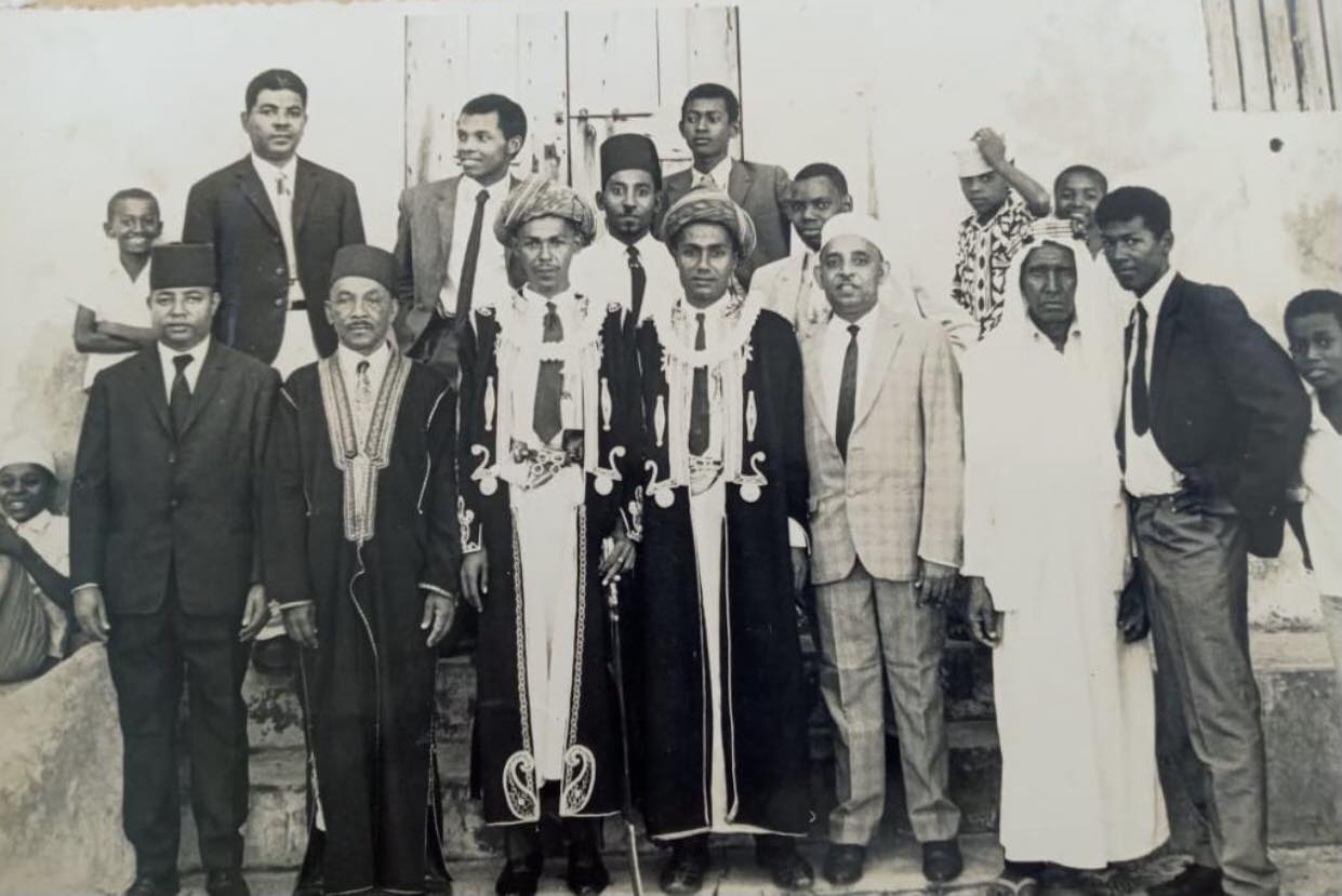 Devant de gauche à droite : Hussein ibn Abdallah ibn Mohammed ibn Anthman AL AHDALI , Mohammed ibn Abdallah ibn Abubakr ibn Said Allaoui (Doukani) ibn Sultan Abdallah 1er AL MASSELA BAALAWI , Kamardine ibn Wakidou Chamanga, Saidomar ibn Salim ibn Allaoui , Said Ahmed ibn Halid ibn Abdallah-sidi ibn Hassan ibn Ahmad AL SHEIKH ABUBAKR IBN SALIM AL BAALAWI, Mwegné Sidi ibn Charif , Zakaria ibn Wakidou CHAMANGA .