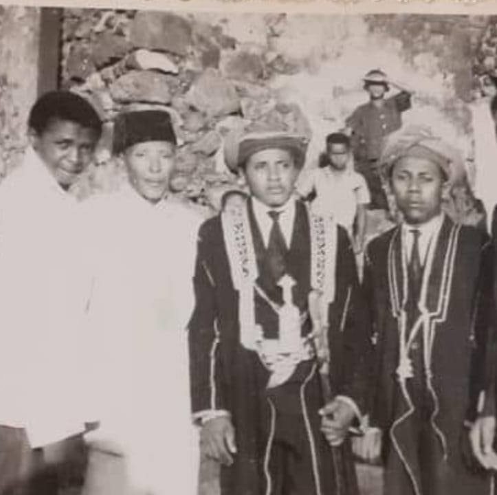 De droite à gauche : Mwegné Djaffar ibn Hemed ibn Abdurrahman ibn Said BAMUALLAM, Mwegné Halid Ibrahim Said Halid Soilih avec son père et son frère Taki Ibrahim Said Halid Soilih.