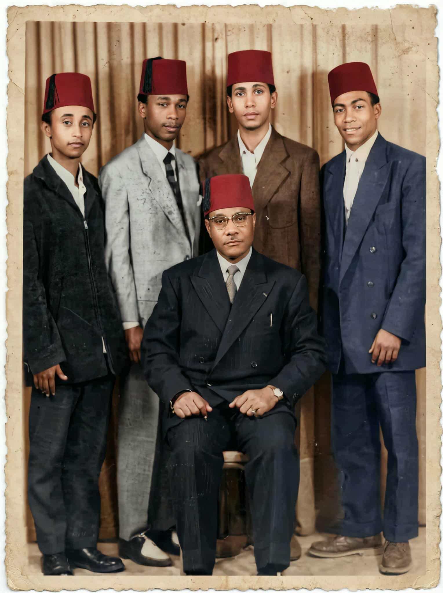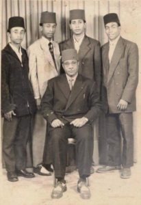 Debout de gauche à droite : Nassuh ibn Saidali (Petit) ibn Abdulwahab ibn Abdallah ibn Sultan Ahmad (Mwegne Mkou) AL SHEIKH ABUBAKR IBN SALIM AL BAALAWI , Inconnu , Abdulkader ibn ahmad ibn Abdulkader ibn Saidali(Marahani) ibn Sultan salim II ibn Sultan Alawi Ier AL MADWA , Said Mohammed ibn Said Turki ibn Charif Abdallah , Assis : Said Turki ibn Charif ibn Abdallah
